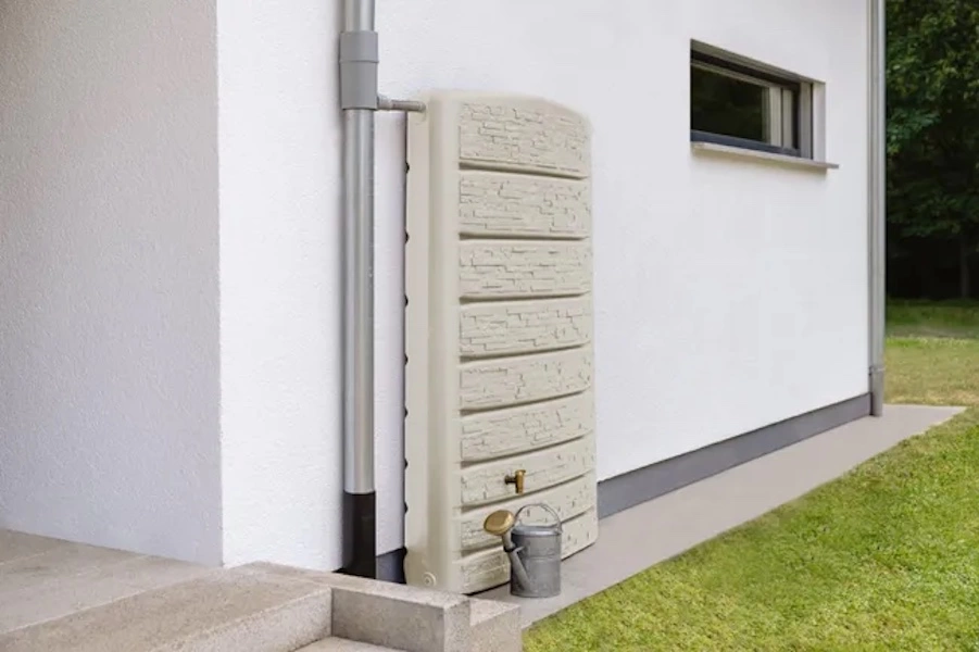 OFFERTCuve de récupération des eaux de pluie, murale moderne extra plate et grand volume de 400 L de stockage. Décor imitation pierre. Couleur sable.